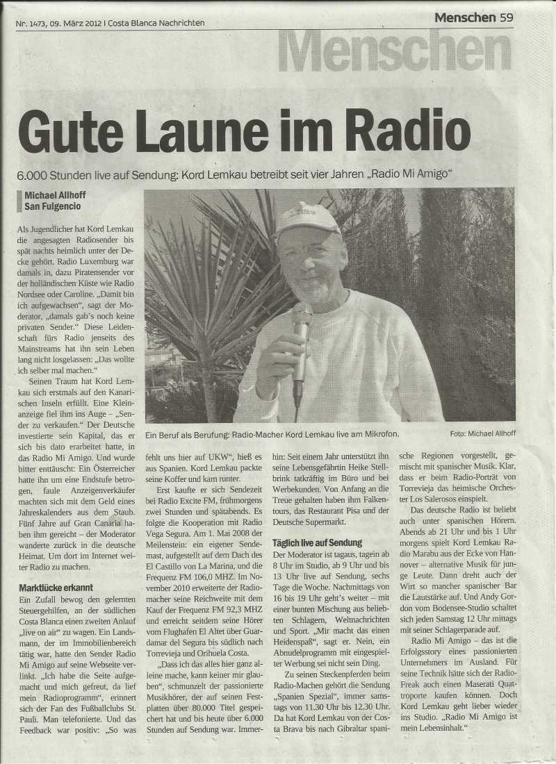 Nachfolgender Artikel der COSTA BLANCA NACHRICHTEN vom 11.07.2008 (demnach sendet man seit Sommer 2008 24 Stunden täglich auf einer eigenen Frequenz 106,0 mHz (bisher 106,5 mHz):